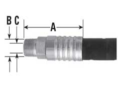型號(hào) | 最大工作壓力 | 末端接口 | "A" 接頭長(zhǎng)度 | "B" 接頭外徑 | "C" 軟管內(nèi)徑 |